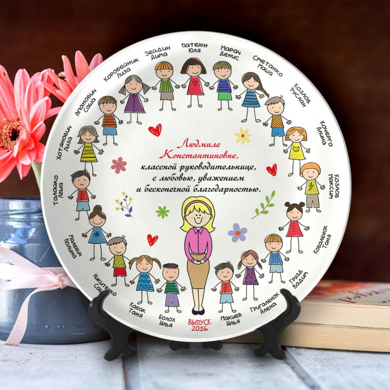 Практично со смыслом. Тарелку можно повесить на стену как панно (украсит кухню или группу в саду), либо использовать по назначению. Но главное — каждый раз, глядя на неё, педагог будет чувствовать благодарность. Дети видят себя частью чего-то важного. Когда малыш пишет своё имя в открытке — это мило. Но когда он видит своё имя на взрослом, красивом подарке рядом с именами друзей — у него формируется чувство принадлежности к коллективу.